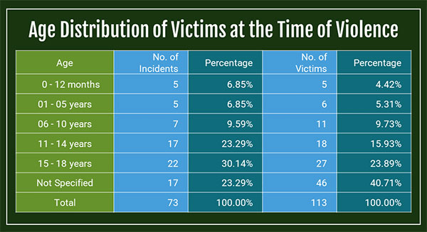 On the other hand, a notable portion of incidents (26%) involved groups as perpetrators, which could include multiple perpetrators from different categories, such as family members, peers, schoolmates and strangers. This suggests that in some cases, children may face violence from various sources simultaneously, making them even more vulnerable and in need of protection. It is also concerning that there were many incidents (10%) where the perpetrator was unknown. This could indicate challenges in identifying and holding perpetrators accountable, as well as a lack of information on the circumstances surrounding the violence. Also, there were incidents where children inflicted harm on themselves, either through missing or suicide attempts. This highlights the importance of addressing not only external threats to children’s safety but also their mental health and well-being to prevent incidents of self-harm..