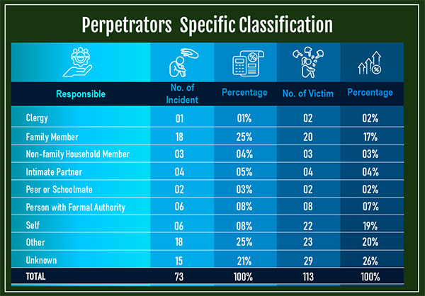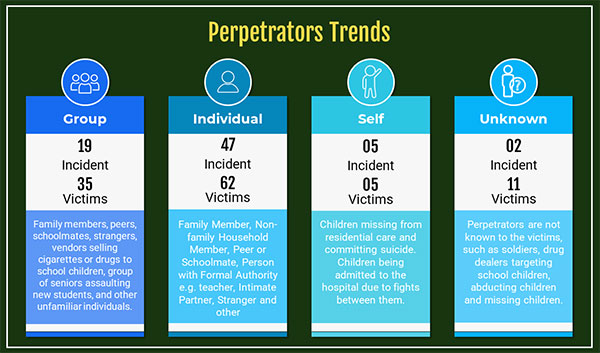 The data presented above provides insights into the specific perpetrators involved in reported incidents of violence against children. It is essential to note that the perpetrators belong to various categories, each with its own unique characteristics and implications.