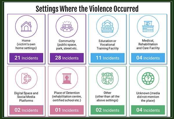 The data on settings where violence occurred presents various locations where incidents occurred. The highest reported setting was in the community, with 28% of incidents occurring in public spaces such as religious worship places, streets and parks. Education or vocational training facilities were another significant setting, with 11% of incidents occurring in these locations. The home was also identified as a prevalent setting for violence, with 21% of incidents occurring within the household. Moreover, the data shows that digital spaces and social media platforms accounted for 2% of reported incidents. As technology plays a significant role in our daily lives, addressing the challenges of violence in online spaces and developing strategies to promote online safety are crucial.