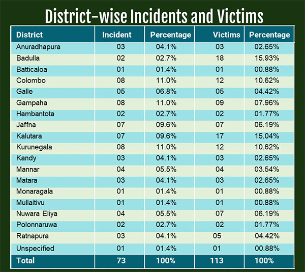 A notable observation from the data is the varying degrees of violence across different districts. Colombo, Gampaha and Kalutara stand out as districts with relatively higher numbers of incidents and victims than others. These densely populated urban areas seem to be more prone to violence, possibly due to factors like higher crime rates and socioeconomic disparities. On the other hand, some districts like Batticaloa, Monaragala, and Mullaitivu have lower numbers of incidents and victims and possibly lower population densities in these areas.