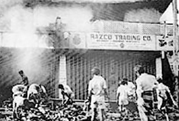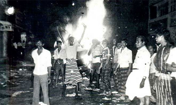 දහවල් 10 පමණ වන විට එය අපේ නගරයට ද පැතිර ආවේ ය.ජාත්යාලයෙන් ඔද වැඩුණු “සිංහලයෝ ” නගර ශුද්ධය අරඹා ඇති බව ආරංචි විය.නගරයේ වෛද්යවරුන් දෙදෙනා ද ඇතුළුව තවත් ද්රවිඩ ව්යාපාර දෙකක් විය.ඉන් එකක් සිංහල දෙමළ බද්ධ ව්යාපාරයක් වූ සරස්වති වෙළඳ ආයතනයයි.අනෙක කුළුබඩු රබර් වැන දේ එකතු කළ චප්පාණිගේ සිල්ලර වෙළඳ සැලයි.එය පිහිටියේ පැරණි පොදු වෙළඳ සල් බිමේ ය.දුටු දෙයින් මගේ සිත මොහොතකට රික්තයක් බවට පත් වි ය.හොරණ බෝ ගස අසල වූ සරස්වති වෙළඳ සල මුලුමනින් ම ආක්රමණය කර තිබිණි.අවට සෙනග ප්රහර්ෂයෙන් යුතුව නරඹමින් සිටියහ.ටොෆි, චොකලට්,විස්කෝතු වැනි ආහාර ද්රව්ය හිසට උඩින් පා වී අවුත් මහ පාරට පතිත වෙමින් තිබණි.සමහර ලුම්පනයන් ඒවා අසුලා ගෙන යමින් තිබිණි. ” මේවා නම් අපරාධ” – මට කීමට ලැබුනේ එපමණ ය.මගේ මිතුරු ග්රාම ‘සූකරයෙක් ‘ මා වෙත හැරුණේ ය. ” ජයදේව මහත්තෙයෝ, තමුසේ කන පලා ගන්නෙ නැතිව යනව ද ” මම නිහඬ වීමි.