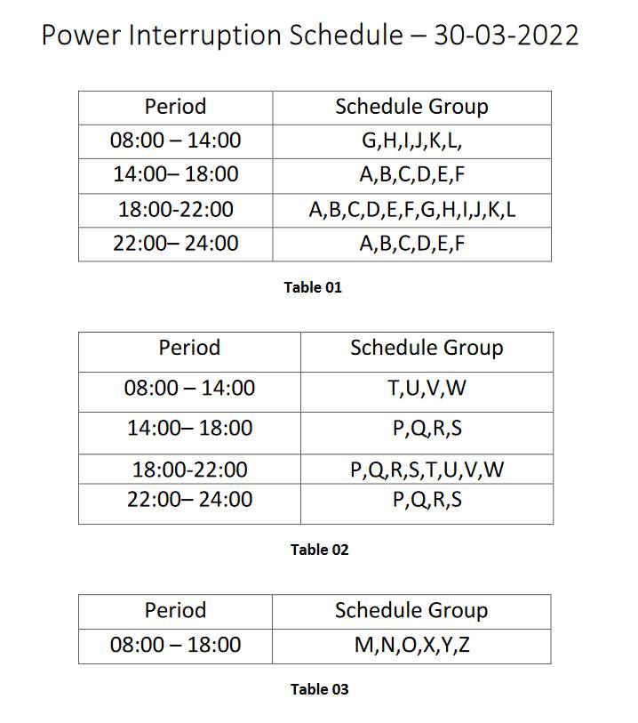 අද මාර්තු 30 (බදාදා) විදුලි කප්පාදුව එක දිගට පැය 10 ක් බොහෝ ප්‍රදේශ සඳහා බලපාන අතර අලුතින් MNO සහ XYZ යනුවෙන් කලාපද හඳුන්වාදී තිබේ.