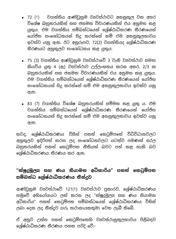 *83 (7) වගන්තිය විශේෂ බහුතරයකින් සම්මත කරගත යුතුය. එම වගන්තිය සම්බන්ධයෙන් ශ්රේෂ්ඨාධිකරණ තීරණය යෝජිත සංශෝධනයන් සිදුකරන්නේ නම් එම අනුනුකූලතාවයන් පහව යනු ඇත.
