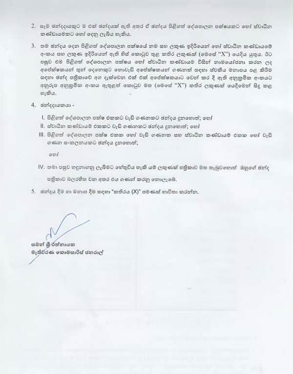 ඉන් අනතුරුව නාමයෝජනා කරන ලද අපේක්ෂකයන් තුන් දෙනෙකුට නොවැඩි පිරිසකට සිය මනාපය පළ කිරීම සඳහා ඡන්ද පත්රිකාවේ අග දැක්වෙන එක් එක් අපේක්ෂකයාට වෙන් කර දී ඇති අනුක්රමික අංකයට අනුරූප අනුක්රමික අංකය ඇතුළත් කොටුව මත X ලකුණක් යෙදිය යුතු බවයි, මැතිවරණ කොමිෂන් සභාව සඳහන් කළේ.
