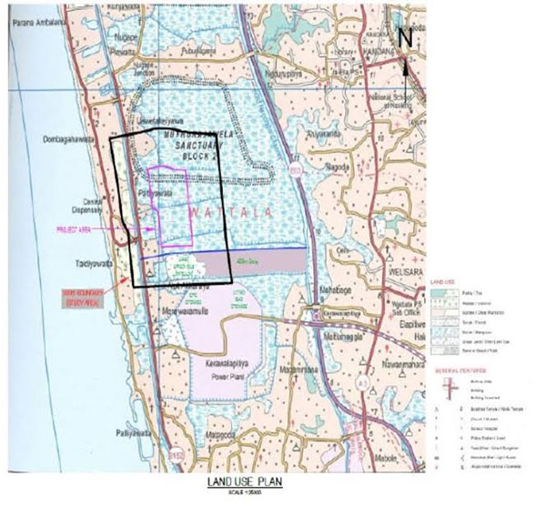 ද්රවීකෘත ස්වාභාවික වායු ඉන්දන බලාගාරය ඉදි කිරීමට ගොඩ කිරීම සඳහා යෝජිත මුතුරාජවෙල පරිසර ආරක්ෂක කලාපය. (රතු පැහැ ඕවලාකාර සලකුණෙන් දක්වා ඇත.)