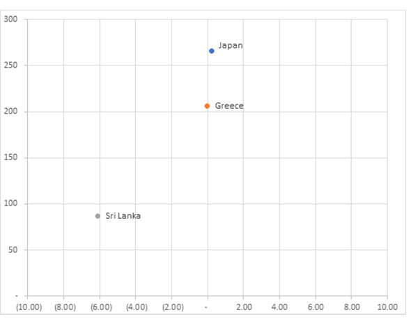 ජපානය, ග්රීසිය සහ ශ්රී ලංකාව – වෙළඳ ශේෂය X අක්ෂයේද රාජ්ය ණය Y අක්ෂයේද දක්වා ඇත.