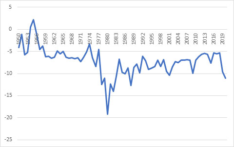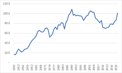 රාජ්ය ණය – ශ්රී ලංකාව ද.දේ.නි.යේ ප්රතිශතයක් ලෙස-1950-2020