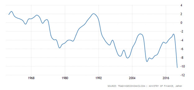ජපානයේද රාජ්ය ණය, අයවැය හිඟය සහ වෙළෙඳ ශේෂය පහත දක්වා ඇත. ග්රීසිය සහ ජපානය අතර වෙනස නම් වසර කිහිපයක් හැරුණු විට දීර්ඝ කාලීනව වෙළෙඳ ශේෂයේ අතිරික්තයක් ජපානය විසින් පෙන්නුම් කර තිබීමයි.