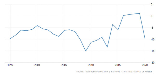 ග්රීසියේ රාජ්ය ණය ද අයවැය හිඟයද පහත දැක්වේ. එක්තරා අවස්ථාවක ග්රීසියේ අයවැය හිඟය ද දේ නි යේ ප්රතිශතයක් වශයෙන් 15% සීමාවටද ආසන්න වේ. 2020 වසරේදී කොවිඩ් හේතුවෙන් සියළුම රටවල අයවැය හිඟය වැඩිවිය.